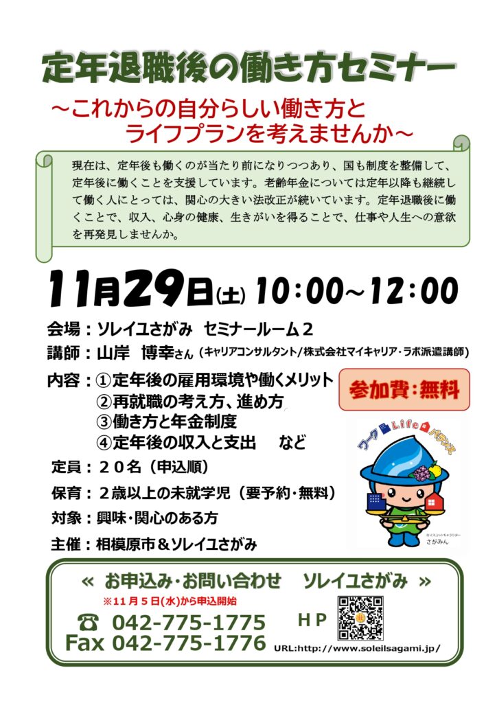 神奈川県相模原市にて、公開講座に登壇しました『定年退職後の働き方セミナー』 2025.11.292026.01.20 開催概要 定年退職後の働き方セミナー~これからの自分らしい働き方とライフプランを考えませんか~ 講師:山岸 博幸開催日:2025年11月29日(土)主催:相模原市&ソレイユさがみ